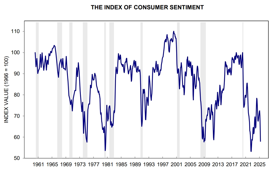 作为参照,周五新鲜出炉的密歇根大学消费者信心指数,已经跌至过去70多年里最差的水平之一。