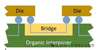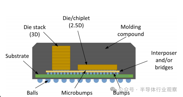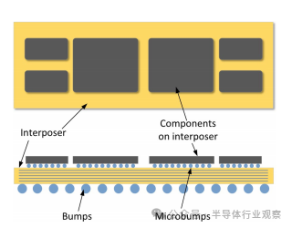 图5:基本先进封装元件。与所有封装一样,它包含一个基板。它还包括一个中介层,元件安装在中介层上并相互布线。微凸块将芯片连接到中介层,凸块将中介层连接到基板,球将基板连接到PCB。