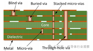 图7:封装基板的横截面。它与PCB非常相似,由多层金属构成,金属层之间由有机电介质层隔开。不同类型的通孔可实现金属层之间的连接。