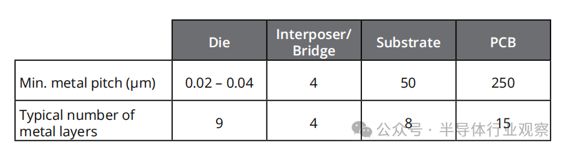 封装所用的基板与印刷电路板相似,但它们与高密度互连(HDI)印刷电路板最为相似。与印刷电路板一样,它们由电介质层和金属层交替组成。因此,它们也类似于半导体的线路后端(BEOL),后者也是由电介质层和金属层交替组成。但基板的特点是采用有机电介质,而不是氧化物。印刷电路板和基板之间的区别更多在于尺寸而非材料。
