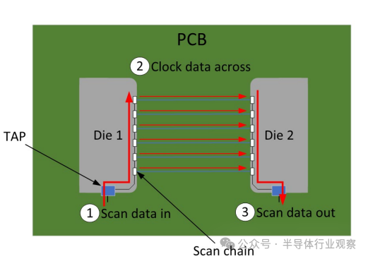 JTAG最初用于测试PC板连接。通过将数据加载到芯片的每个引脚,可以在连接的芯片上检测到结果,从而验证PCB连接的完整性。同样的方法也可用于测试封装基板上的芯片。
