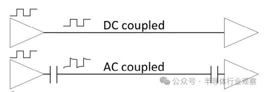 图28:直流耦合线路与交流耦合线路。交流耦合线路上的电容器可消除连接中的直流电流,但需要信号转换才能通过电容器