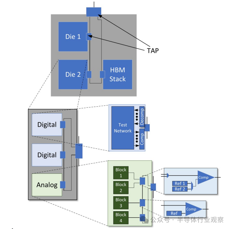 图30:包含两个芯片和一个HBM堆栈的示例封装。每个芯片包含两个数字模块和一个模拟模块。数字模块通过IEEE 1687进行测试;模拟模块通过未来的IEEE 1687.2进行测试。HBM堆栈的逻辑可以通过JTAG进行测试,并使用MBIST测试存储单元。