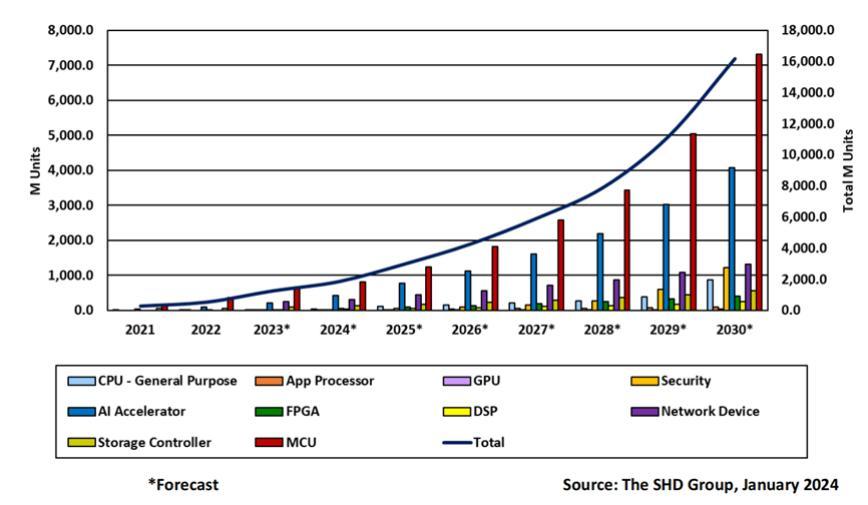 根据SHD集团的统计,2023年,全球基于RISC-V内核的SoC产品出货量是12.6亿颗,预计2024年将达到20亿颗,到2031年将会突破200亿颗。其中,出货量占比最大的是MCU,2023年RISC-V MCU出货量为6.17亿颗,预计到2030年,出货量可达73亿颗,年复合增长率为42.4%。