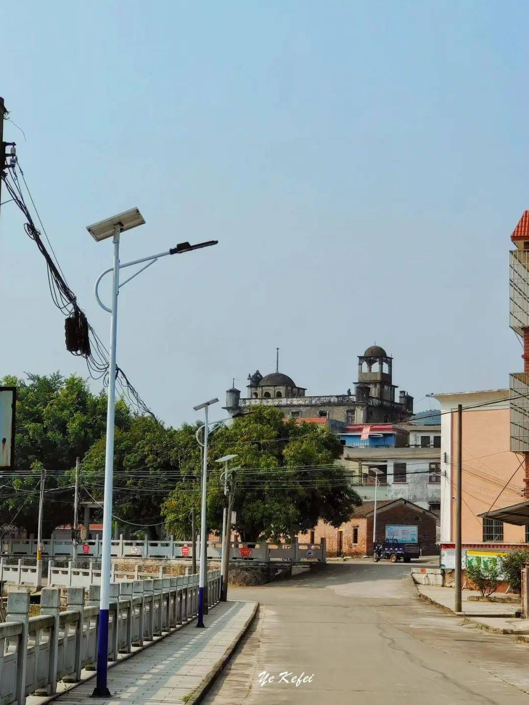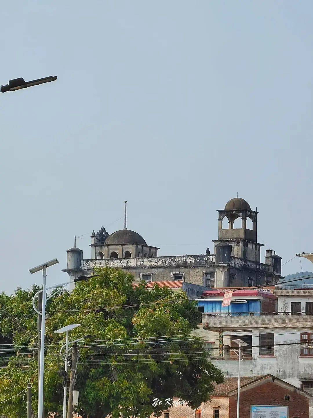 车子一驶入肇庆高要区白诸镇北凤村委会北岸村,远远就可见到遗志堂的存在。即使村民早已建起几层的新居,可遗志堂的顶端仍然抢眼。从侧面望去,它面向正面有一个圆穹顶凉亭,承托着外立面的山墙,后面有一个更高的圆穹顶小亭。
