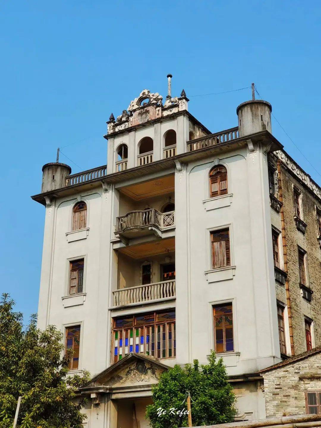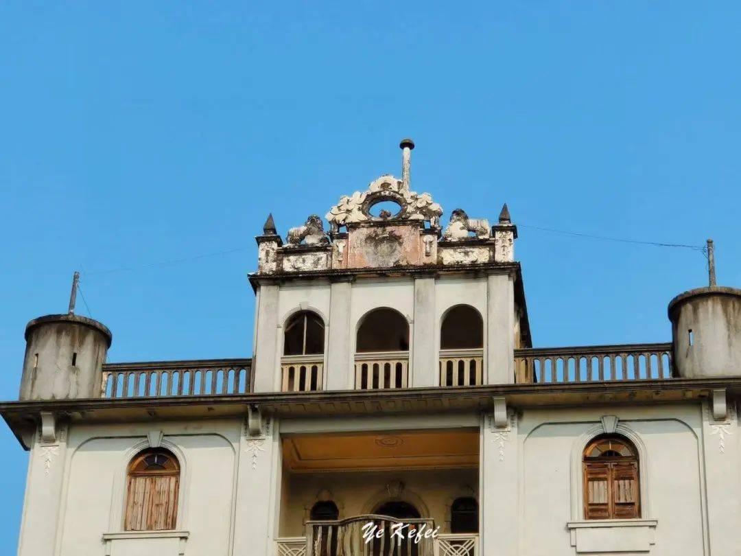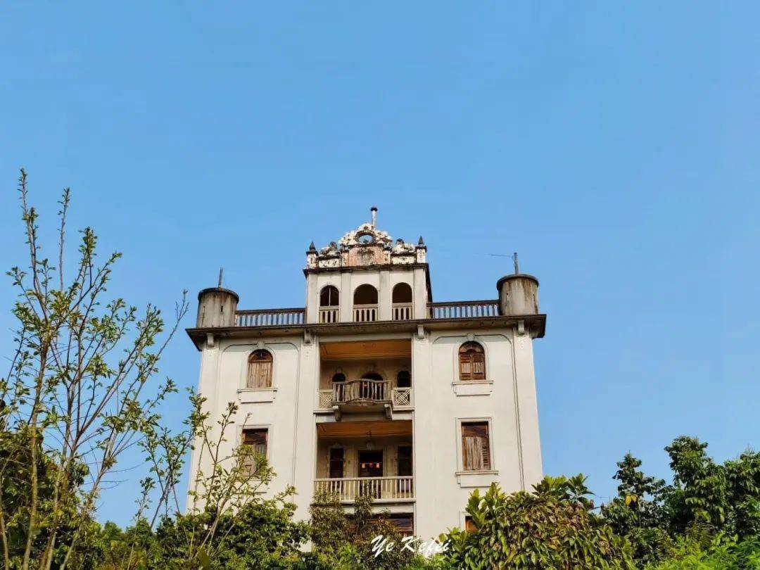 可惜的是,院门紧闭,连靠近看看的机会都没有。资料显示,大门为八字型红水泥七级阶梯,一楼大厅立柱为仿欧洲古典风格古罗马柱,左右以花玻璃隔开厢房,后部设一神台,这也是南粤旧时洋楼和碉楼内部常见的中西合璧格局,二至四层均设一厅一房。