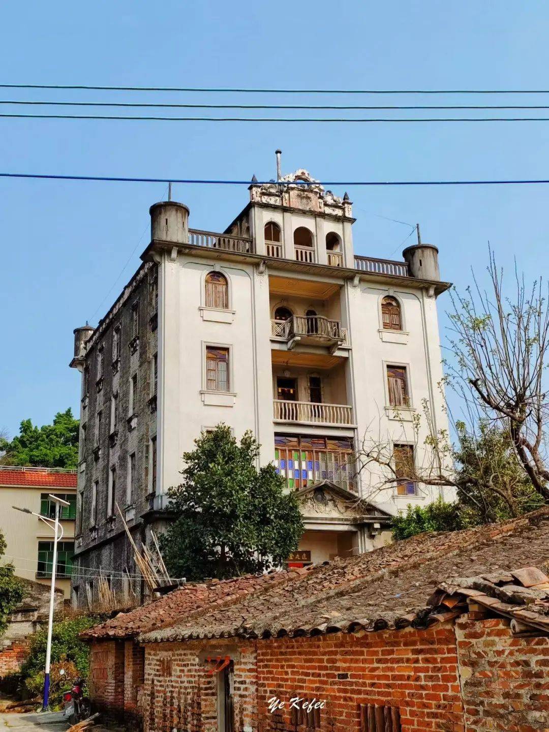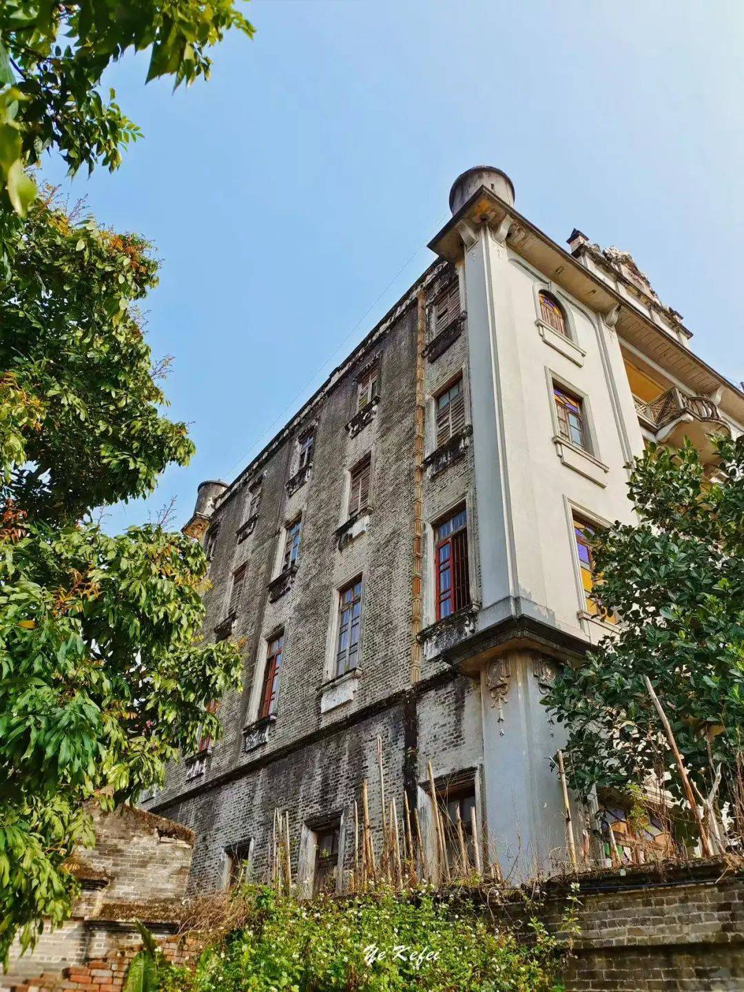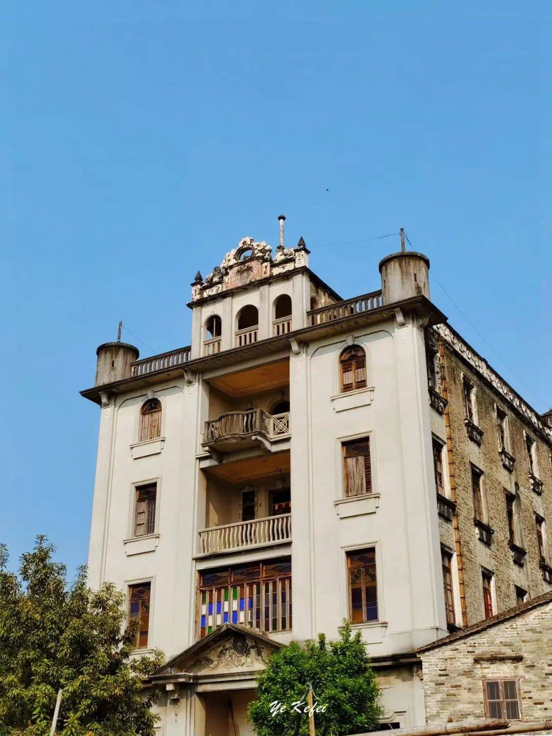 可惜的是,院门紧闭,连靠近看看的机会都没有。资料显示,大门为八字型红水泥七级阶梯,一楼大厅立柱为仿欧洲古典风格古罗马柱,左右以花玻璃隔开厢房,后部设一神台,这也是南粤旧时洋楼和碉楼内部常见的中西合璧格局,二至四层均设一厅一房。