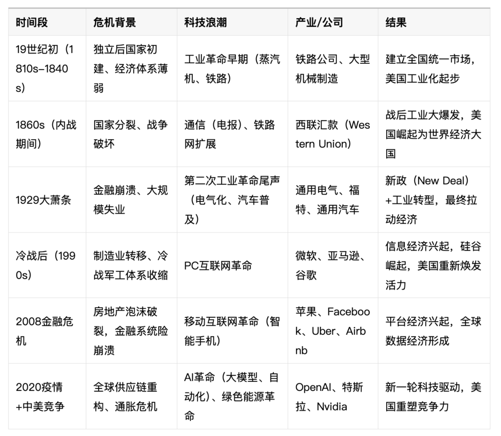 历史上,美国每次危机后,依靠“人才+资本+容错+科技”四大机制,皆能重启增长曲线。