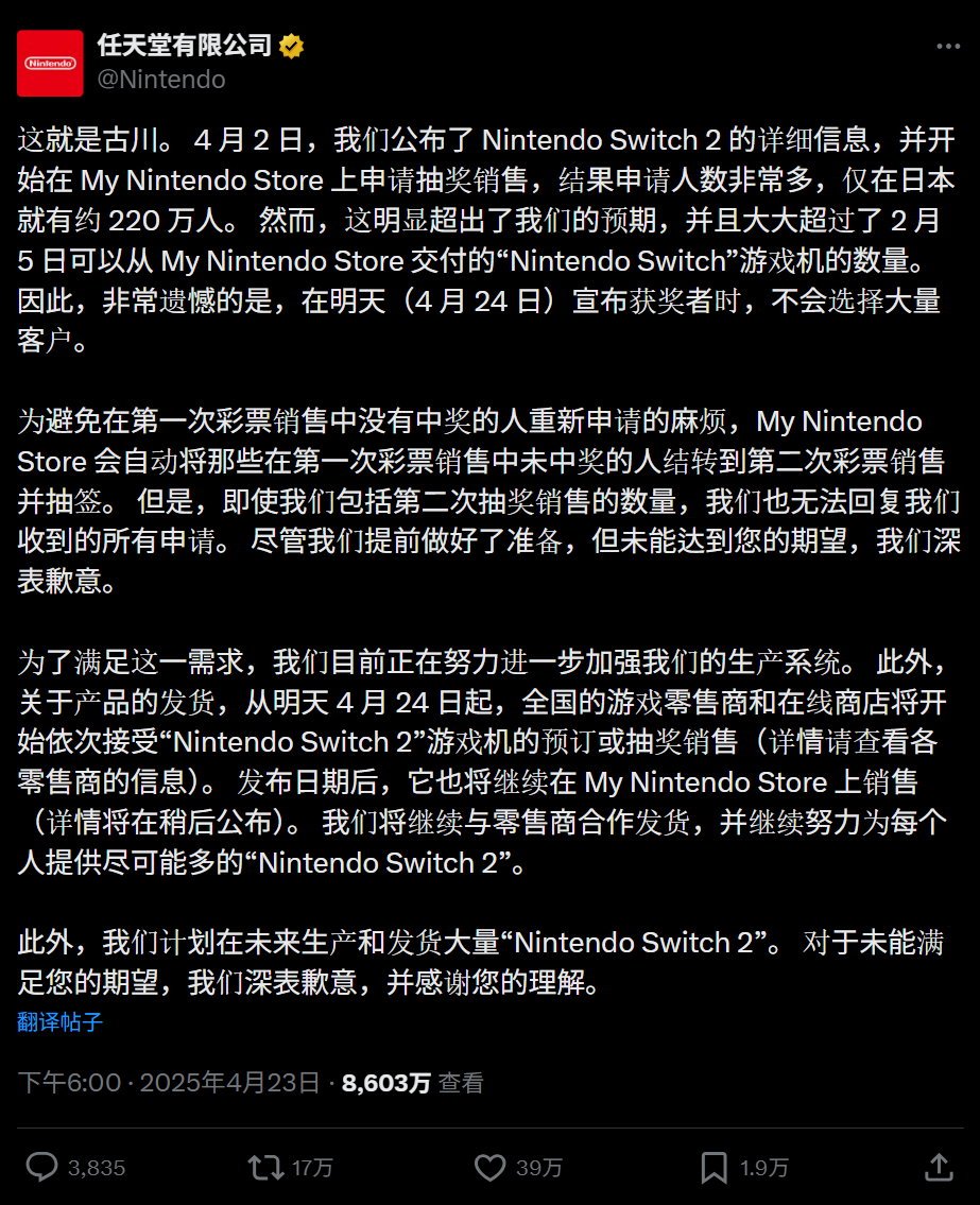 定于6月5日发售的任天堂Switch2,在这两天进行了首批购买资格抽选。