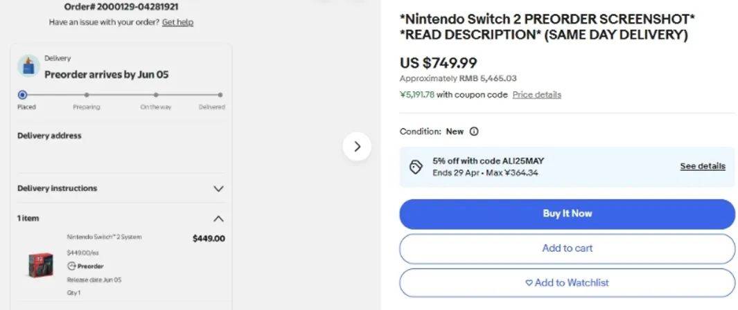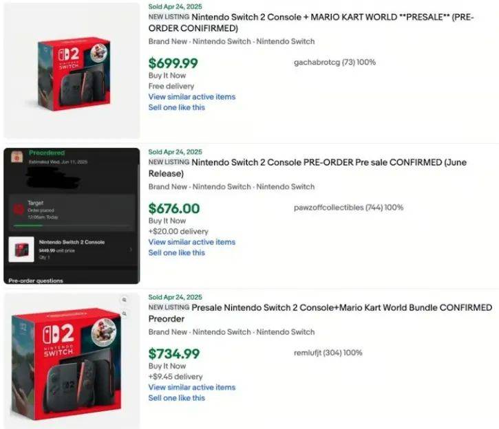 但在抽选结果出炉后,eBay等交易平台上还是立马出现了大量加价转卖Switch2的卖家。原价449美元和499美元(马车捆绑包)的机器,被炒到了645起步的高价,溢价最高甚至到达了250美元。