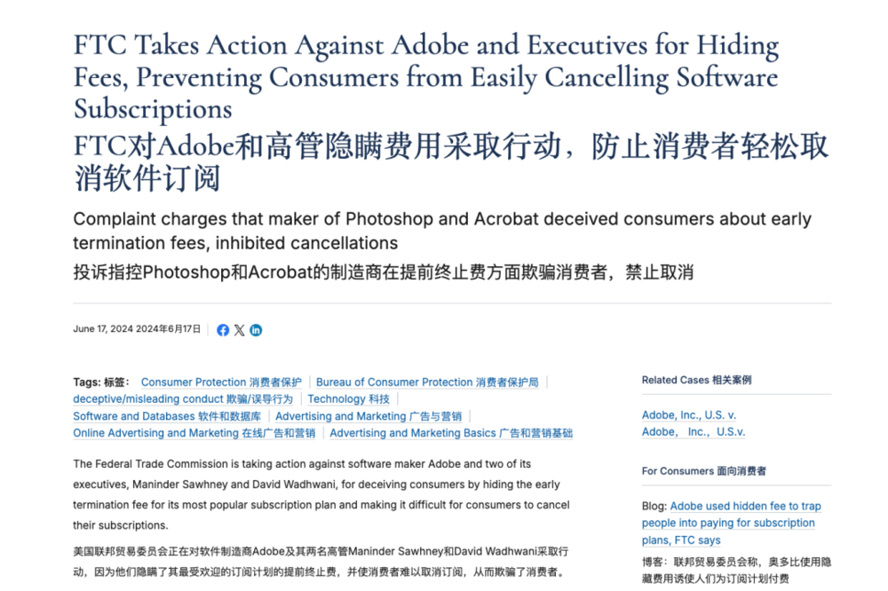 去年六月,Adobe(对,就是大家很熟悉的PS软件的母公司)就被美国联邦贸易委员会指控,说这家公司在用户不知情的情况下给用户注册默认的套餐,却没有清晰披露相关的重要条款。