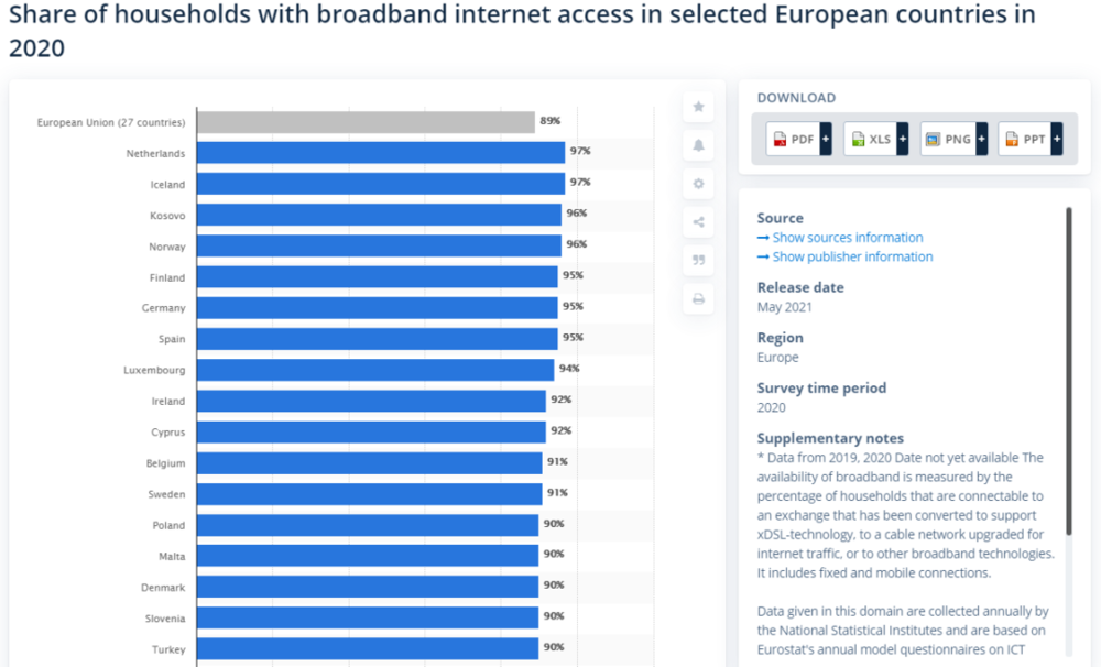 欧盟2020年宽带报告显示,2019年,高速宽带在欧盟国家的覆盖率为44%,使用100Mbps及以上网速的家庭只有26%。