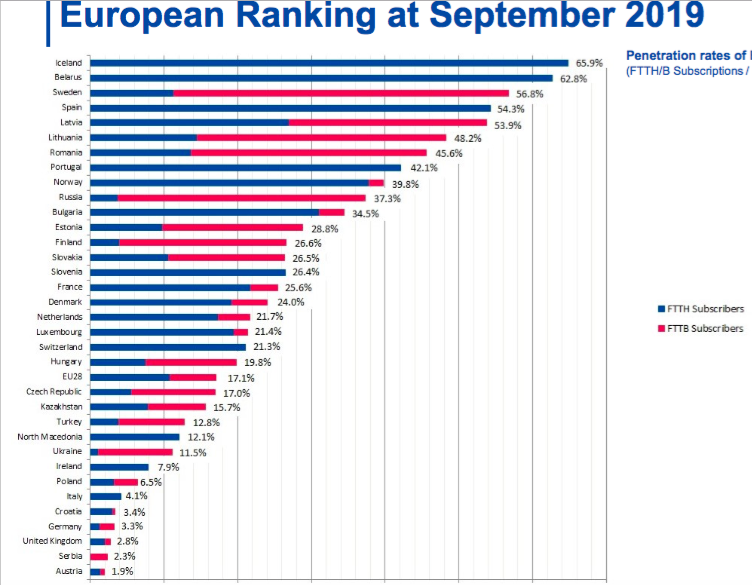 在欧盟内部,网络发展水平呈现不均衡状态。从光纤宽带(包括FTTH光纤到户和FTTB光纤到楼)的覆盖率来看,2019年三季度时瑞典、西班牙、拉脱维亚排在欧盟国家前三位。
