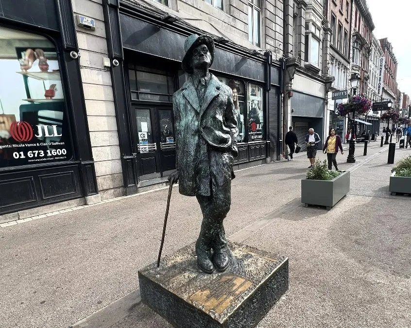 奥康奈尔大街上有很多塑像,皆是一些为爱尔兰的独立而发起各种运动、甚至献出生命的名人,大街上还有一根高高的尖塔,全钢筋建筑,甚是壮观。相比这些,乔伊斯的塑像简直就是小巫见大巫。似乎也没有多少路人理睬他,偶尔有几个游人匆匆拍照,然后又匆匆离开。