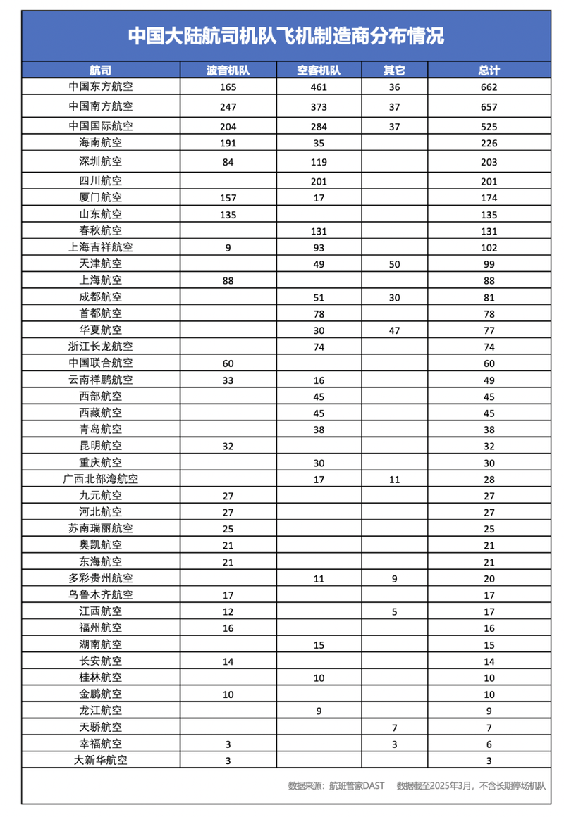 航班管家数据显示,截至2025年3月,国内41家航司中,约59%的航司拥有波音机队,其中全波音机队的航司就有14家,主要为山东航空、上海航空、中国联合航空、昆明航空等航司,厦门航空波音机队占比达到了90.2%,海南航空波音机队占比达到84.5%。