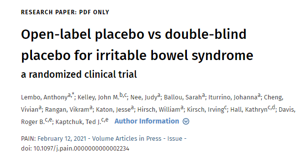 [1] Lembo, A., Kelley, J. M., Nee, J., Ballou, S., Iturrino, J., Cheng, V., Rangan, V., Katon, J., Hirsch, W., Kirsch, I., Hall, K., Davis, R. B., & Kaptchuk, T. J. (2021). Open-label placebo vs double-blind placebo for irritable bowel syndrome: a randomized clinical trial. Pain, 10.1097/j.pain.0000000000002234. Advance online publication.