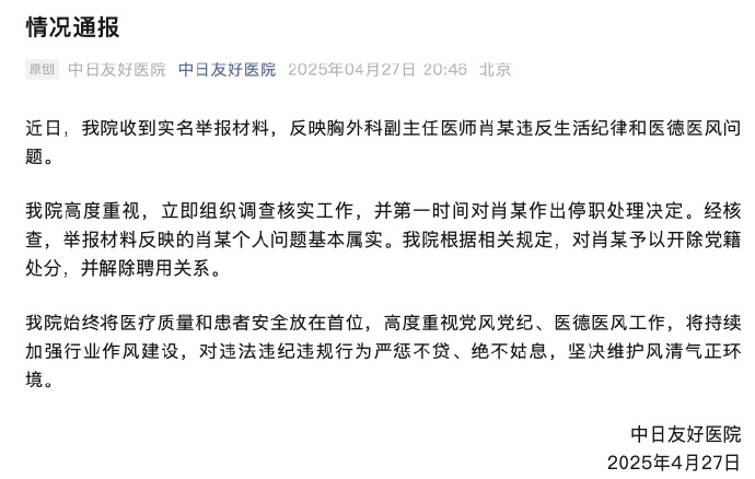 4月27日,中日友好医院发布官方通报称,收到实名举报材料,反映胸外科副主任医师肖飞违反生活纪律和医德医风问题。立即组织调查核实工作,第一时间对肖某予以开除党籍处分,并解除聘用关系。4月29日,医院官网胸外科医生名单中已无肖飞,而肖飞个人简历页面已无法正常打开。