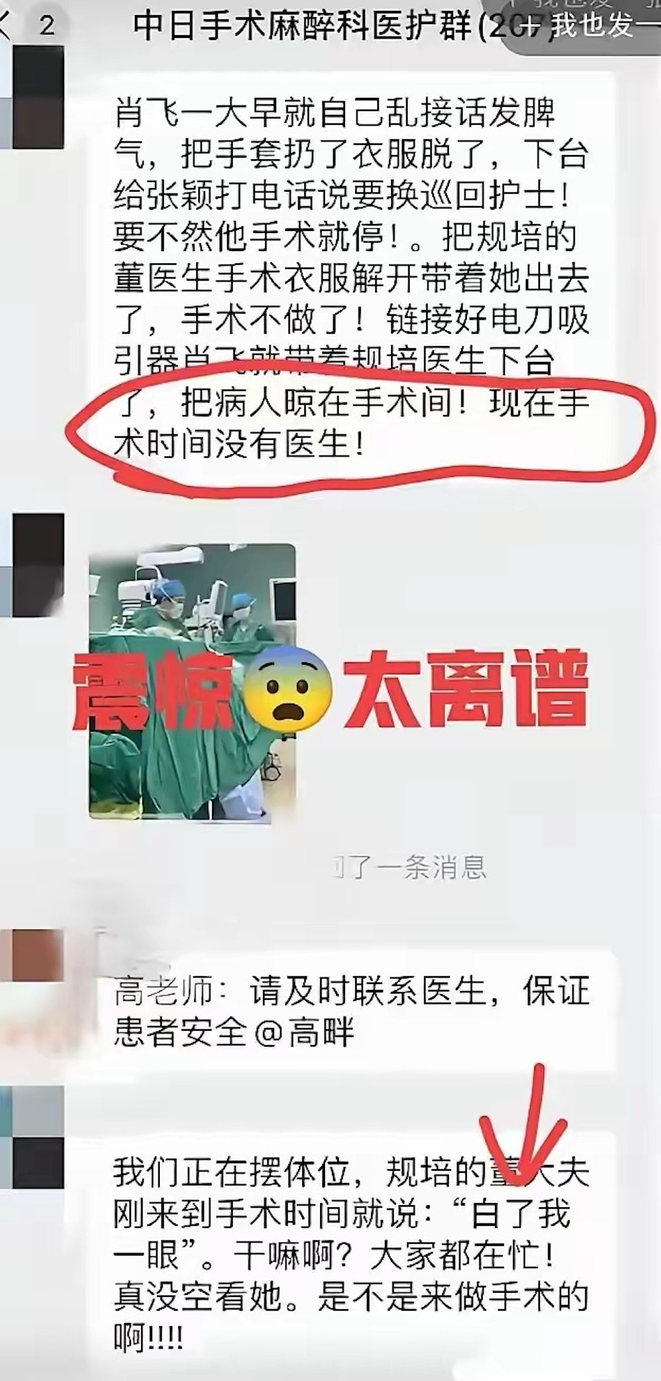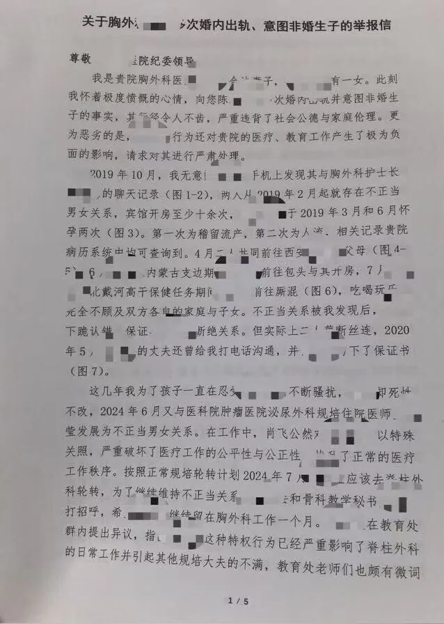 根据一封4月中旬就在网络上流传的举报信称,这位39岁的副主任医师婚内多次出轨,涉及对象至少五六人,其中尤以同科室护士长和同届规培生董某最为瞩目。二人先后怀孕,而规培医师董某腹中胎儿已临近预产期。但值得注意的是,肖飞的妻子还在举报信中披露了肖飞为维护规培医师,在2024年7月5日手术时,对斥责该医师的护士大吼,丢下麻醉病人并与规培医师离开手术室长达40分钟的违规事件。
