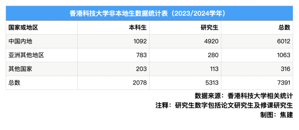 再以《财经》记者查询到的香港大学相关数据为例:在2023/2024学年度,该校有16794名新生入学,包括本科生4638人,修课式研究生11067人,以及研究式研究生1089人。在这些新入学的学生中,非香港本地学生占到了60.7%。非本地生源包括中国内地、亚洲其他国家、澳大利亚与新西兰、欧洲、北美以及南美和非洲等众多地区。