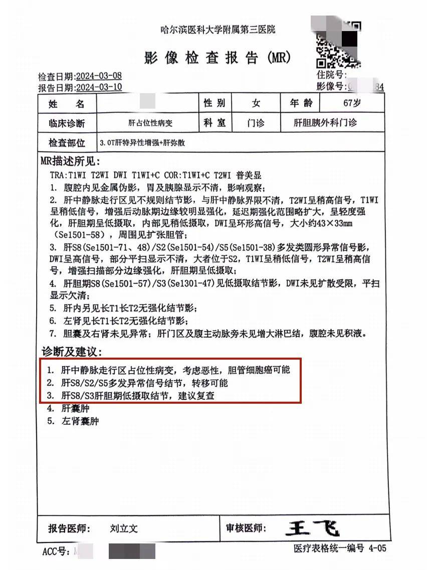 下午预约的增强核磁检查,影像报告第二天中午出了结果。“我记得很清楚,报告结论是肝中静脉走形区占位性病变,考虑恶性,胆管细胞癌可能性大。关于转移情况,报告显示肝的S8、S2、S5 多发异常信号结节,考虑转移可能。”小高此时平静地说道。