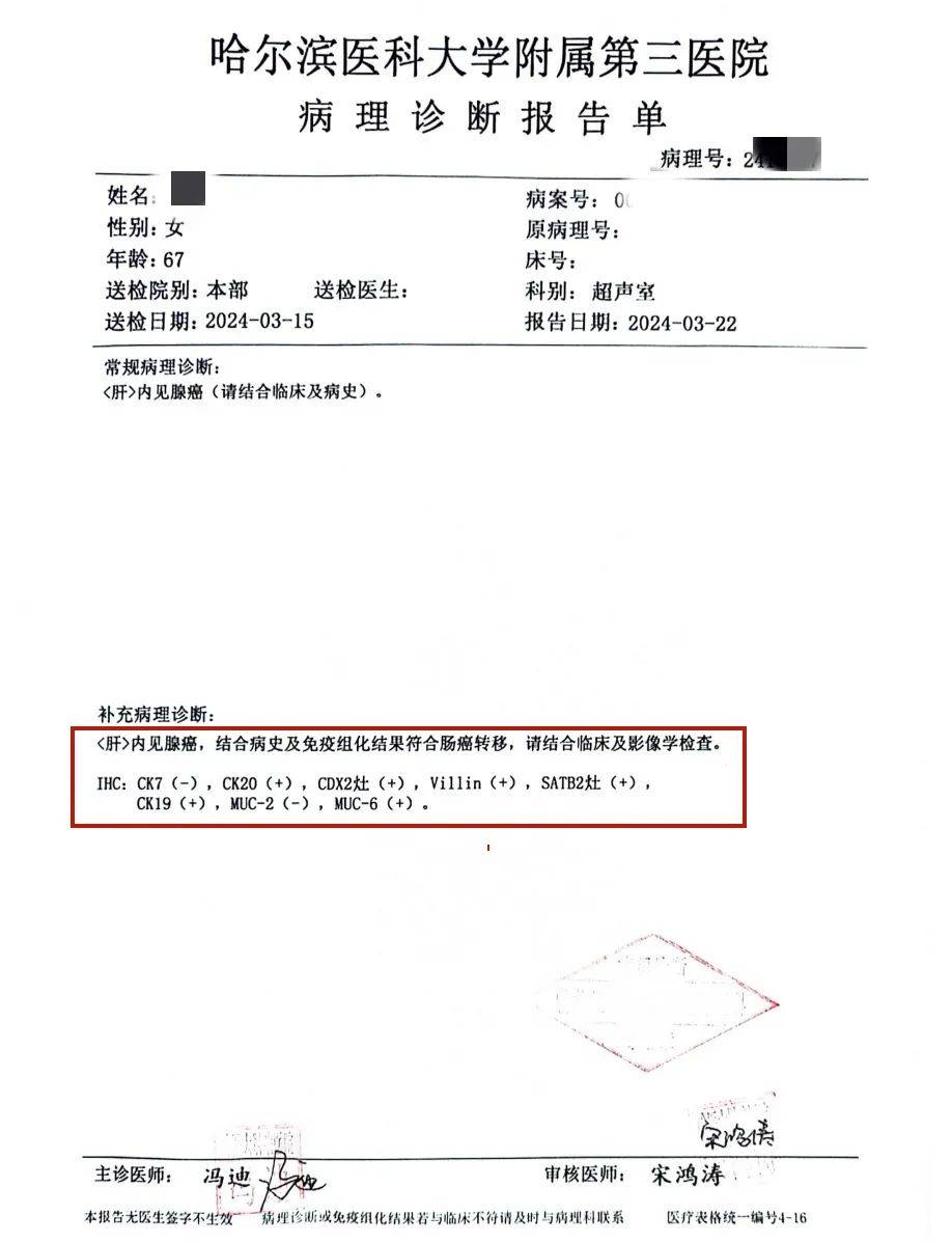 肝穿刺活检和胃肠镜活检提示均为腺癌,张主任叮嘱加做免疫组化,最终结果提示符合肠癌肝转移(后续基因检测显示微卫星稳定,无法使用免疫治疗),小高母亲就此确诊了十二指肠原发癌合并肝多发转移。