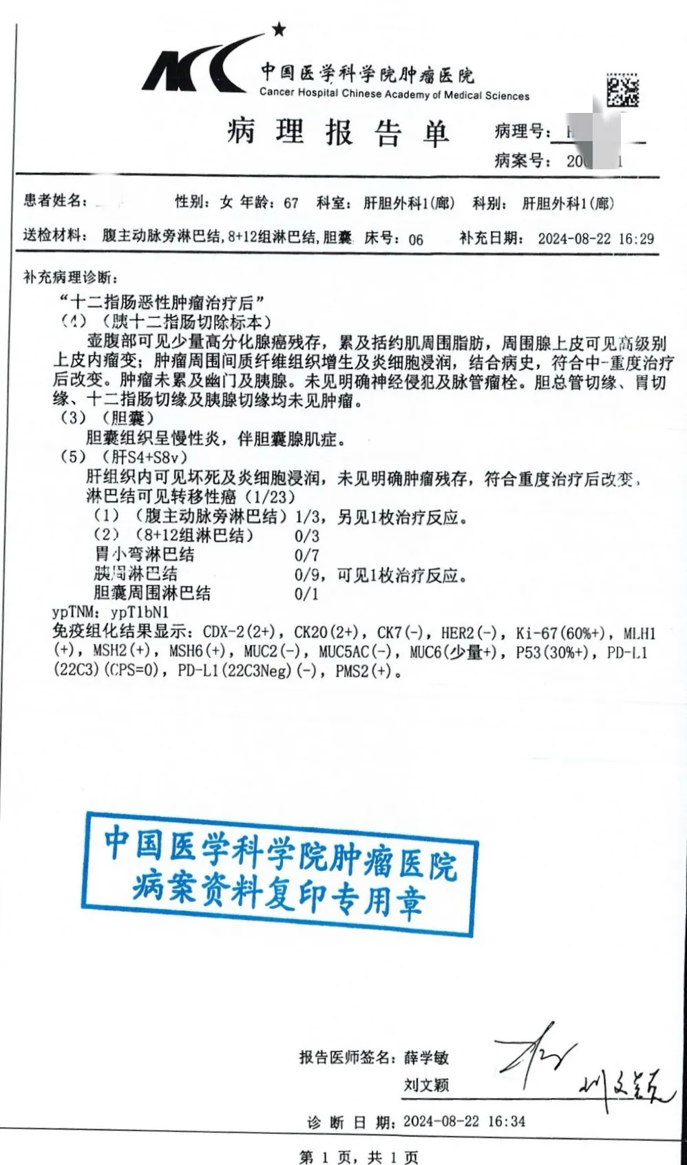 很快小高母亲的术后病理出结果了,病理提示肝上病灶已无活性,这说明前期盲试的化疗方案极其有效,他立即把这个满载着奇迹的病理发给了张主任,张纯慧主任回复了简短却满含高兴的两个字:真好!