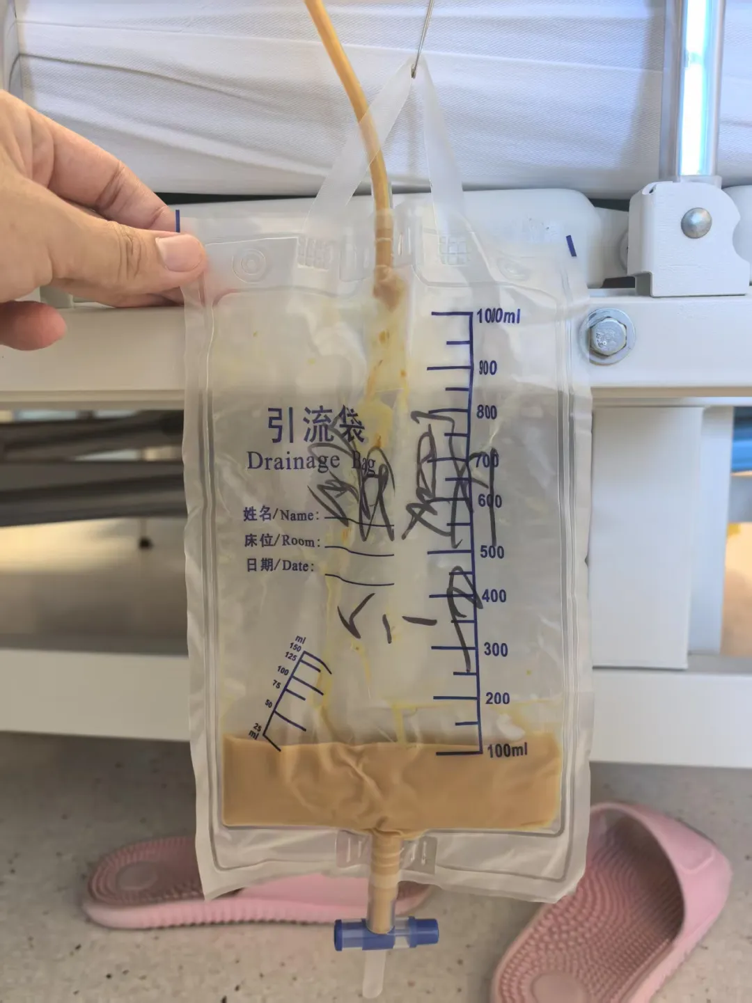而这次引流因为插进去的引流管特别细,而积液又特别多,直到最后小高母亲腹腔的术后引流管都拔了,这根穿刺引流管却跟着小高母亲一起出院,甚至术后的第一次化疗都带着它,直到回廊坊复查准备让管床大夫拔的前一天,这根跟着母亲一个多月的管子才像终于完成了自己的使命似的,突然自行脱落了。