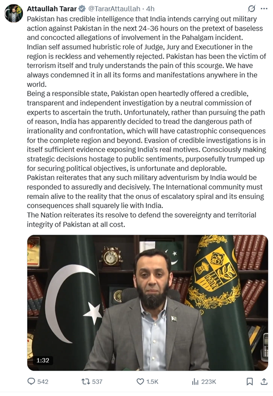 “巴基斯坦掌握可靠情报,印度计划在未来24至36小时内以毫无根据、捏造的所谓巴基斯坦参与帕哈尔加姆事件的指控为借口,对巴基斯坦采取军事行动。”塔拉尔在社交媒体平台X上发帖称。