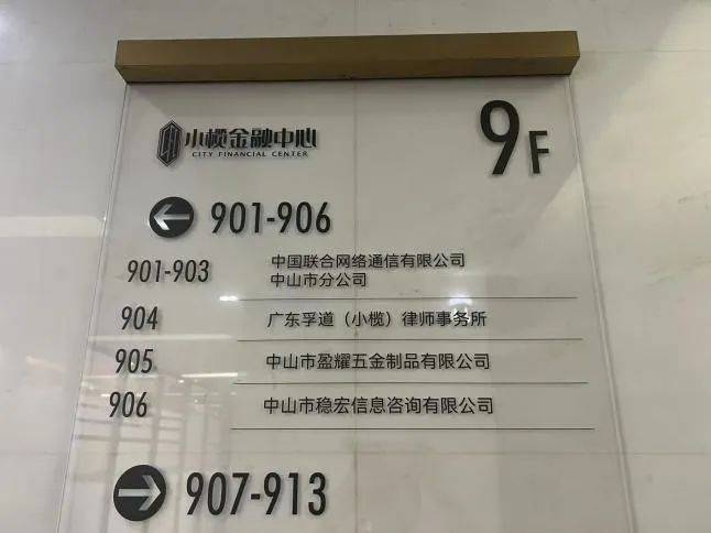 记者发现,小榄金融中心楼层索引处显示906单位为“中山市稳宏信息咨询有限公司”。根据天眼查信息,该公司成立于2023年9月6日,法定代表人为卢永强。记者拨打该公司在天眼查上留下的电话,显示“电话已停机”。小榄金融中心物业管理处相关负责人则表示,906单位就是金钥匙的办公地,只是注册的公司用了“中山市稳宏信息咨询有限公司”这个名字。