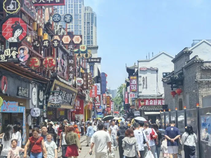 五一商圈作为长沙热门旅游目的地,临近中午已经“人气爆棚”。黄兴路步行街、太平老街、国金街等繁华地段人流如织,不仅有拖着行李箱的外来游客,不少本地人也携家共游。有本地人士对财联社记者表示,今年步行街新装了电子大屏,尽管人多,但还是想过来凑凑热闹。