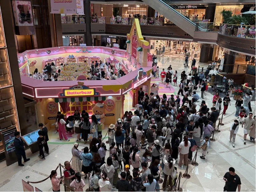 “首发首秀”经济也同样火热。风靡国际的“黄油小熊”主题艺术展上海首展“五一”期间展出,财联社记者现场看到,店铺所在的商场中庭围满了拍照打卡的人,上百人排队等待进店购买“黄油小熊”限量商品。