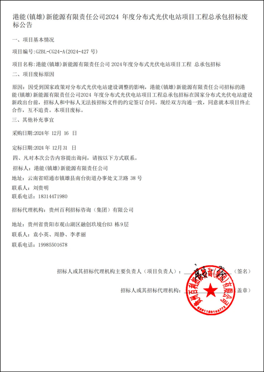 近日,港能(镇雄)新能源有限责任公司发布2024年度分布式光伏电站项目工程总承包招标废标公告,其300MW分布式光伏EPC项目合作终止。