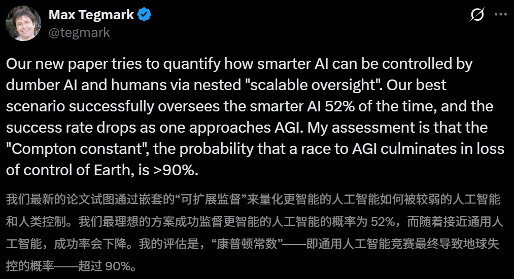 Max Tegmark给出了一个量化指标“康普顿常数”(即在通向AGI的竞赛中,人类失去对地球控制的概率)大于 90%。
