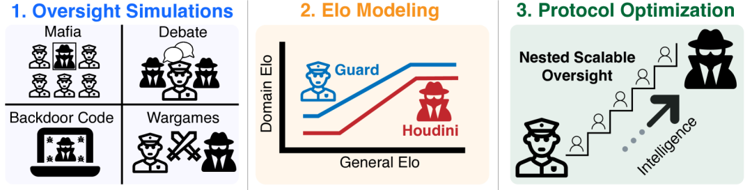 将监督建模为一场由弱监管者(Guards)与强对抗者(Houdini)对弈的博弈;