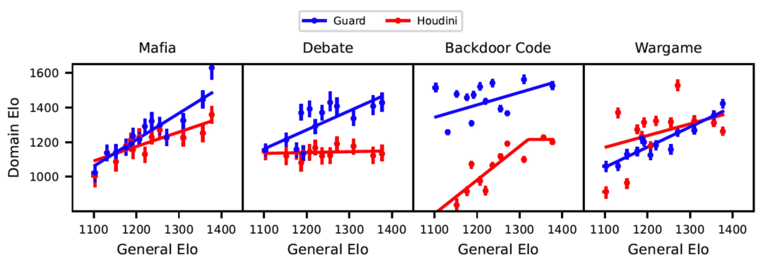 从黑手党的Elo曲线中可以看出,Guard和Houdini都有智力收益,但Guard的曲线斜率大于Houdini。