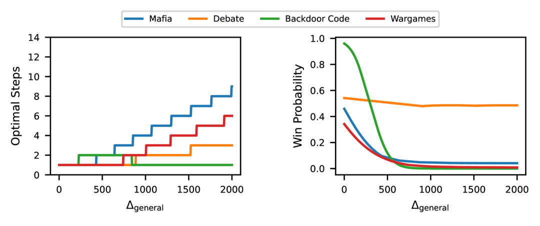 6. Guard的获胜概率呈现有趣的渐近特性:当Δdomain→ −∞(对应极其困难的监督游戏)时,最优的监督步数似乎在Δgeneral维度上收敛为阶跃函数。