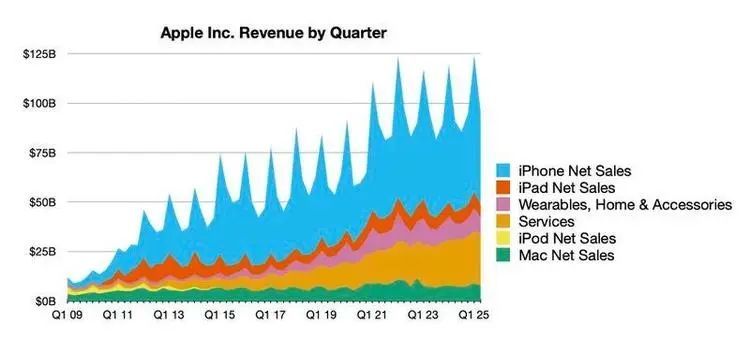 因此,蒂姆·库克也试图强调苹果的抗风险能力。他在电话会议上表示,回顾三月季度,并未观察到关税影响导致用户需求大幅提前的明显证据,渠道库存变化也不大,尽管为了预防确实建立了一部分库存。然而,相比这些积极表态,市场更关注库克关于关税影响的负面预测——“预计关税将在(财年)三季度造成成本增长9亿美元。”市场的担忧还集中在占总收入54%的iPhone营收同比下降10%,以及作为生态核心的服务业务增速放缓上。