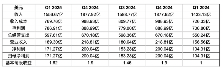 再来看苹果,其第一季度整体表现稳健,营收和利润都略好于预期。总体营收为907.5亿美元,同比虽下降4%,但仍略好于市场预期的903.3亿美元;每股盈利为1.53美元,略高于预期的1.50美元;净利润达到236.4亿美元,同比下降约2.2%,亦略高于市场预期的231.7亿美元。苹果的毛利率维持在46.6%的高位,净利率为26%,较上一季度有所下滑。