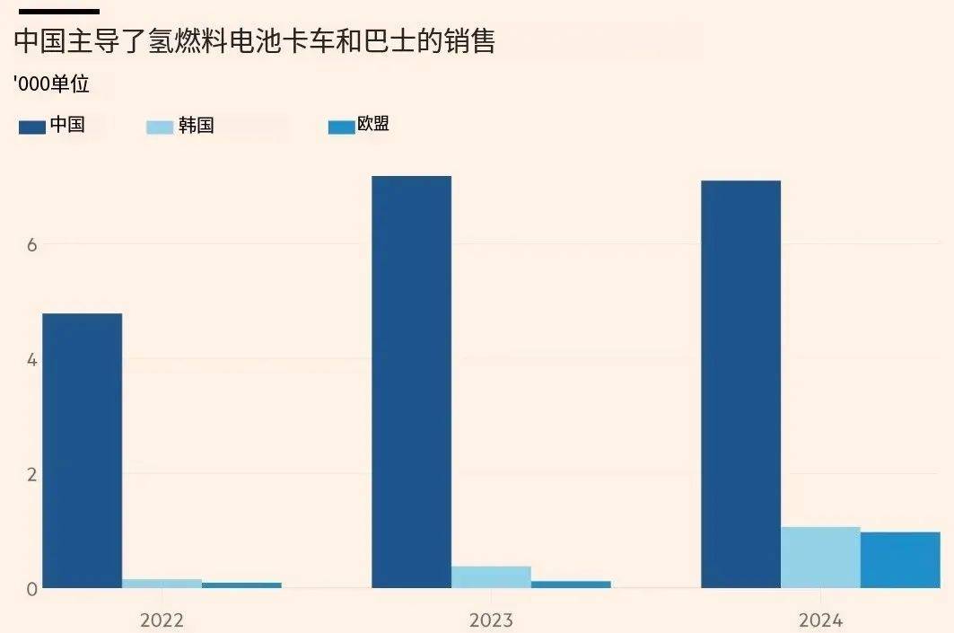 数据提供商英特锐分析公司的数据显示,2024年,中国氢燃料电池公交车和卡车的销量为7069辆,高于世界其他所有地区的销量总和。