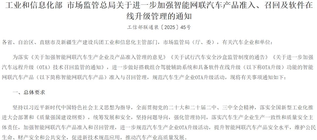 《关于进一步加强智能网联汽车产品准入、召回及软件在线升级管理的通知》解读