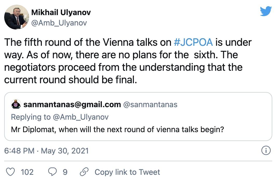 @Bloomberg【Iran and World Powers Resume ‘Final Round’ of Nuclear Deal Talks】俄罗斯驻国际原子能机构(IAEA)外交使节Ulyanov:伊朗与国际社会启动第五轮核协议谈判,这轮谈判应该是最后一轮。