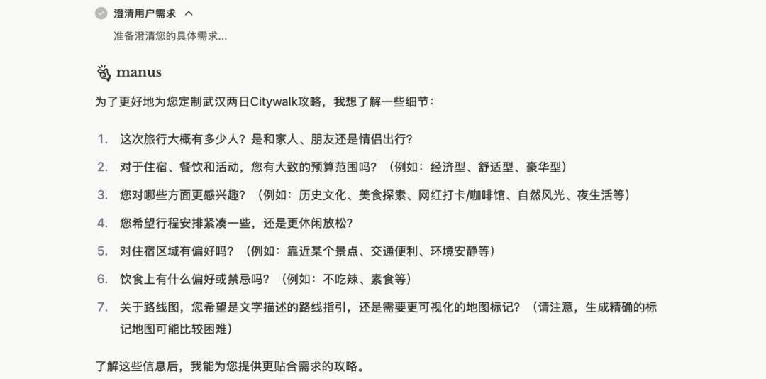 目前看来,无论是通用Agent或AI搜索,还是旅游产品推出的AI助手,大部分都还不能很好地拆解用户的需求。旅行往往都是突发奇想,锁定一个点再去探索更多未知。相比一站式完成用户的任务,尽可能细致地了解用户需求更为重要。我会觉得,马蜂窝的AI路书和Manus采用的询问更多细节的机制,能够让用户的需求更精准,让攻略制作更有效。