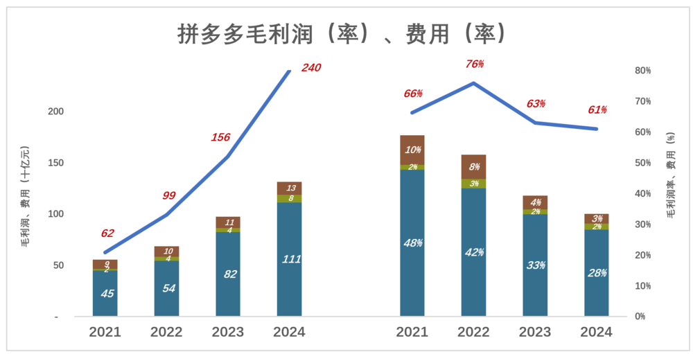从2019年的238亿到2024年的2400亿,拼多多毛利润在5年间增长908%,年均增长159%!