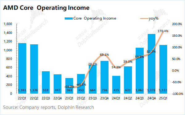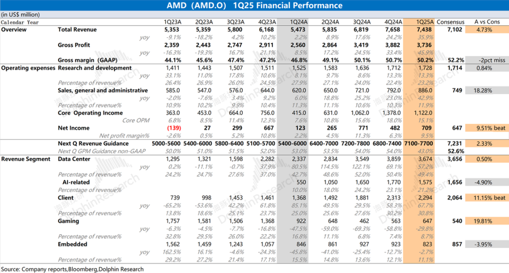 1. 整体业绩:收入&利润双双同比提升。AMD在2025年第一季度实现营收74.4亿美元,同比增长35.9%,好于市场预期(71亿美元)。收入端的增长,主要来自客户端业务和数据中心业务的带动。AMD在2025年第一季度实现净利润7.1亿美元,若剔除摊销等相关影响,公司本季度核心经营利润11.2亿美元,同比增长170%,核心经营利润率为15.1%。