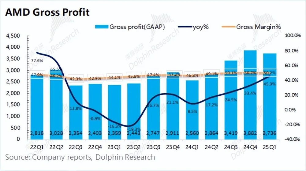AMD在2025年第一季度实现毛利37.4亿美元,同比增加45.9%。毛利端的增速超过收入端,主要是因为毛利率也在提升。
