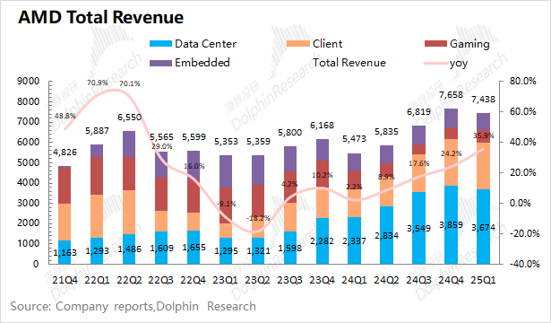 AMD在2025年第一季度实现营收74.4亿美元,同比增长35.9%,好于市场预期(71亿美元)。公司本季度收入端的增长,主要来自数据中心业务和客户端业务的增长带动。其中,客户端业务的表现,是营收端超预期的主要来源。