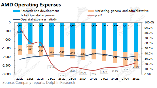 AMD在2025年第一季度的经营费用为26.1亿美元,同比增长22%。其中研发费用和销售及管理费用都有不同幅度的增加。