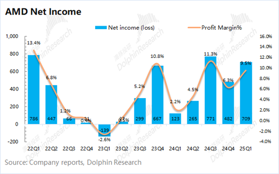 AMD在2025年第一季度实现净利润7亿美元,好于市场预期(6.5亿美元)。本季度净利率9.5%,有所回升。