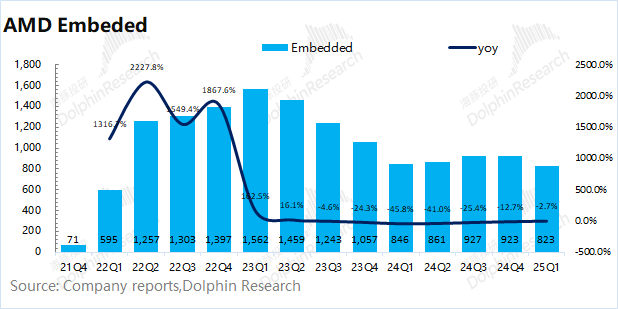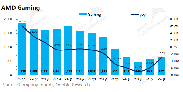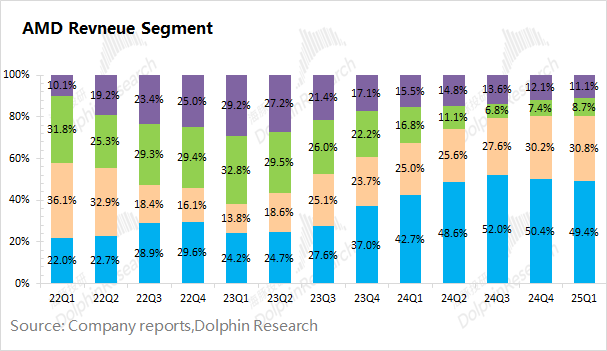 (1)游戏业务:公司的游戏业务在2025年第一季度实现收入6.5亿美元,同比下滑29.8%。尽管 Radeon 显卡的销售额有所增长,但半定制产品的销售下滑,抵消了前者的增长表现,当前游戏机渠道的库存已恢复到正常水平。