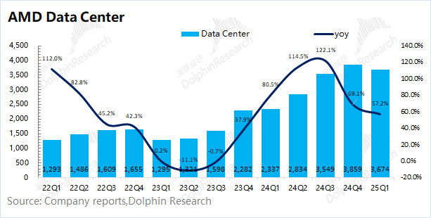 AMD的数据中心业务在2025年第一季度实现收入36.7亿美元,同比增长57.2%,市场预期(36.6亿美元)。本季度的增长得益于AMD Instinct GPU以及第四代和第五代AMD EPYC CPU销售的拉动。